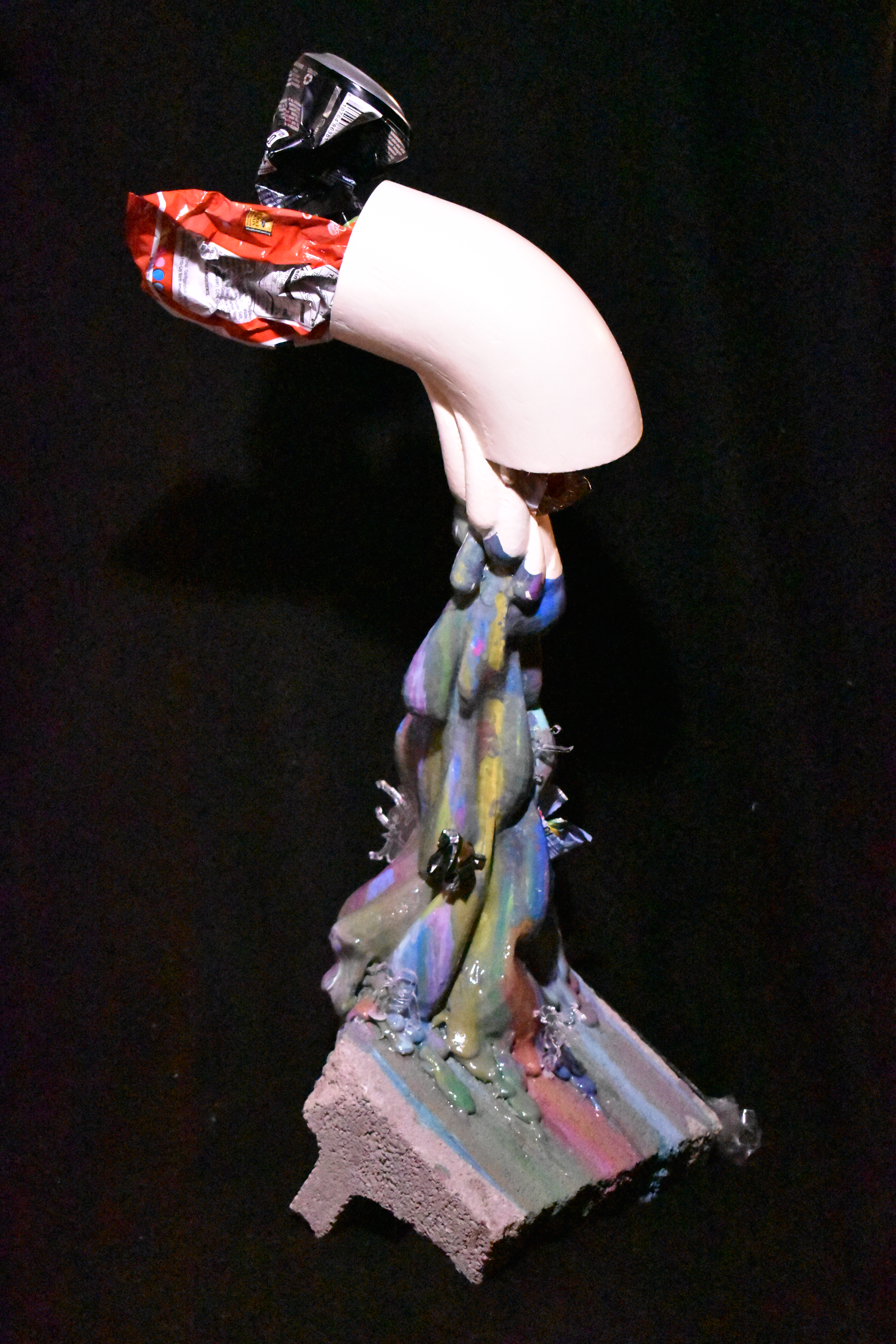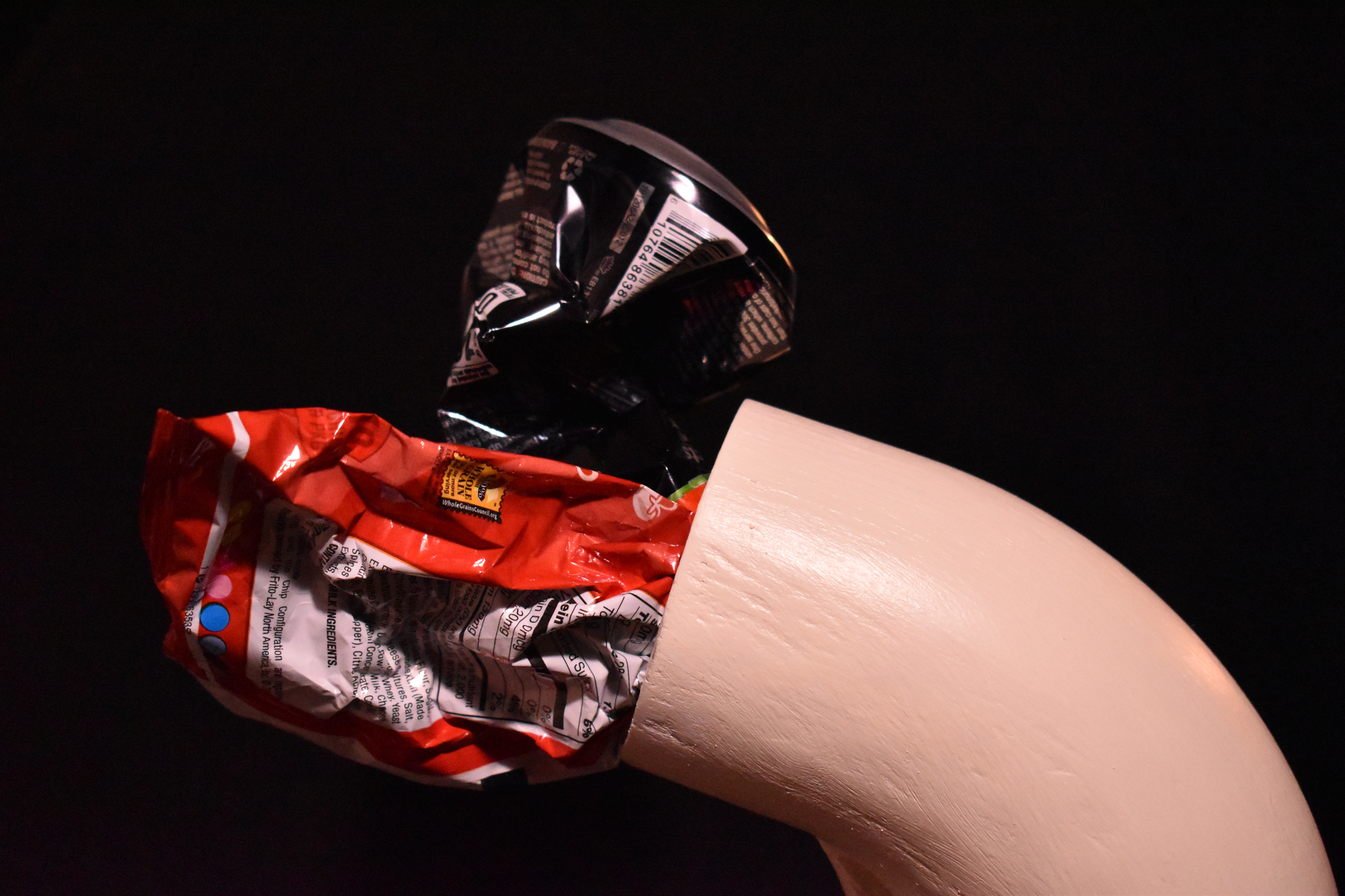 These two points are what really drove my design process. Given that CSO’s lead to places we typically rest, relax, and play by, I chose to represent the tube-like form of a CSO as waterslide. My plan is to 3D print this tube, but its form could prove challenging to print cleanly. On one end of the waterslide is a found piece of PVC filled with found trash that would have otherwise ended up in the Olentangy. To emulate water, I plan on laser cutting pieces of black acrylic into teardrop/water droplet like shapes. On one of the water droplets at the beginning of the PVC pipe, I plan to engrave the word “CLEAN” to call to question the quality of the water we’re knowingly and willingly imposing on our waterways. On the other end of the slide is a child looking up to the sky with their mouth open, as if catching snowflakes. I chose to do this to further emphasize the danger of the CSO as it relates to play/leisure as well as consumption.